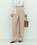 【鹿の子編みクルーネックカーディガン】 サイズ感: 着丈49.5cm。コンパクトなシルエット。 素材感: ポリエステル100% ご自宅で手洗い可能。ポリエステル素材の鹿の子編み。 着用感: ぽってりとした厚みが可愛いショート丈のカーディガン。袖口と裾のリブ幅を長めにすることで、コンパクトなシルエットに。前を閉じて一枚着として、ボタンを開けて羽織りとして着回しを楽しめるアイテムです。 【ウォッシャブルサテンワイドパンツ】 サイズ感: ウエストは後ろゴム仕様ではき心地楽ちんです。 素材感: (表地)ポリエステル100%、(裏地)ポリエステル100% 日本製。ご自宅で手洗い可能。発色が良く軽さがあり、吸水速乾性に優れ、シワになりにくいイージーケア素材。 着用感: シルクの様な光沢感を表現したサテン素材を使用したパンツ。あえてプレスをきかせたきれいめなフォルムに仕上げた1枚。Tシャツ、シャツ、ニットと夏から秋まで長いシーズン着回せます。