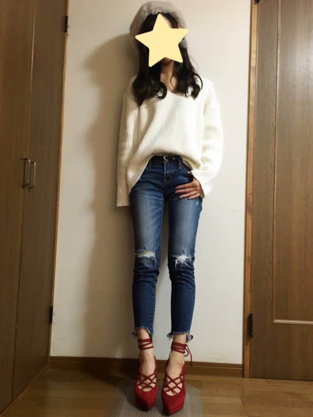 程よいゆるさのニット🌛💭💘💘 デニムに赤ヒールや 差し色に赤ヒール合わせるのやっぱり好き☺️💓🎶