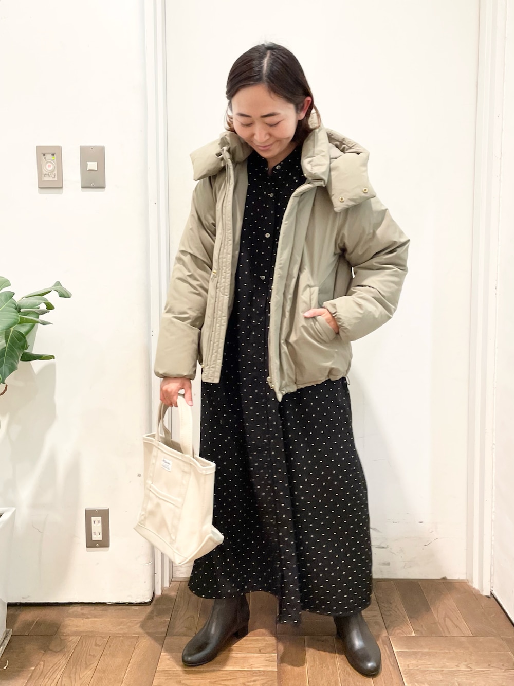 フードが取り外しできるダウンジャケット💡 印象が変わるので、着回しが楽しめます。 中に着たドットのワンピースも、サラッと1枚で着られておすすめです●○