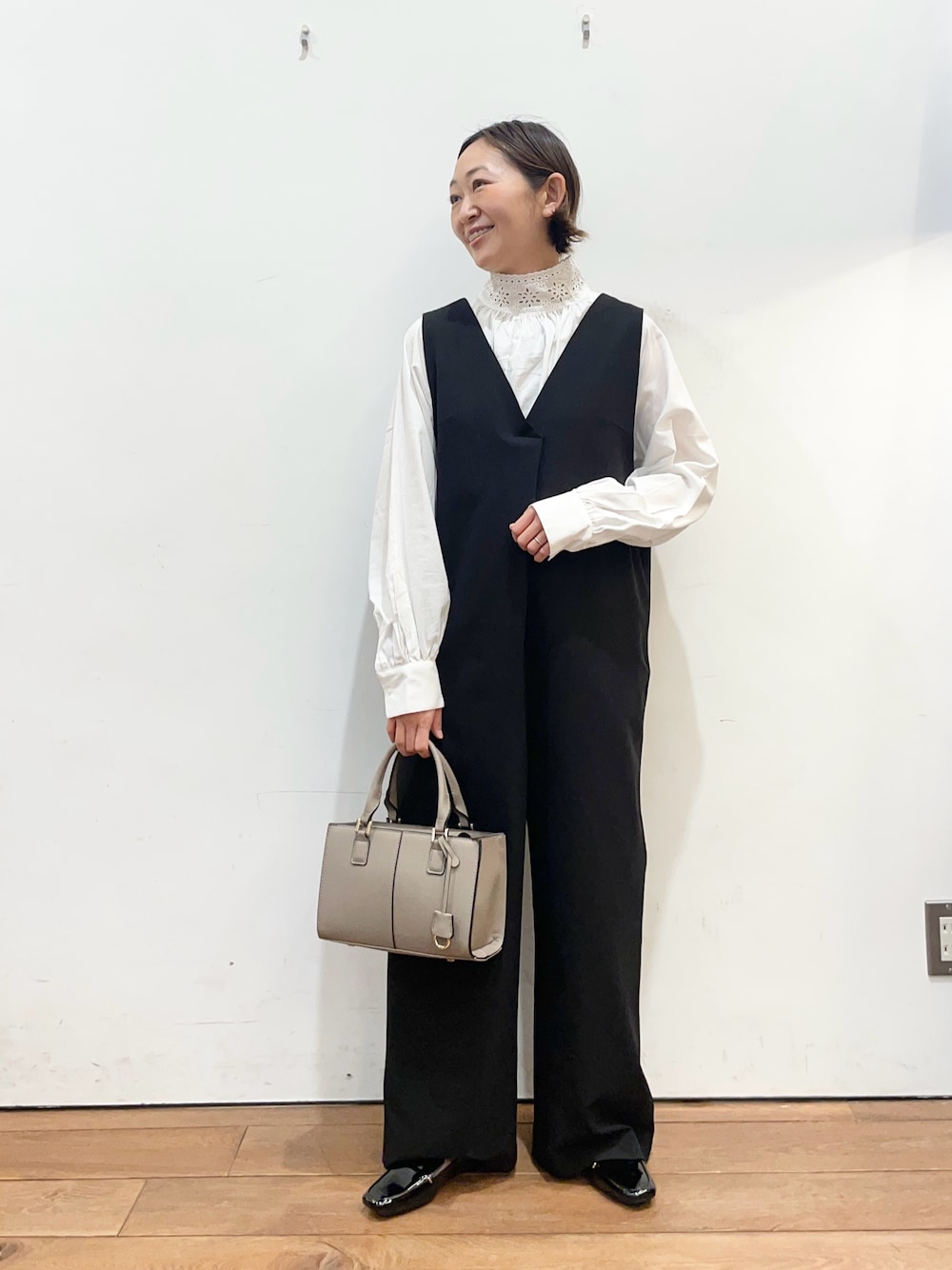 いつもご覧いただき、ありがとうございます✨ 先日も着用したオールインワンですが、 中のブラウスを変えるとまた雰囲気も変わります💡 綿素材のブラウスは首元のデザインが可愛いです◎ オールインワン、着回しがかなりきくのでおすすめです☺️