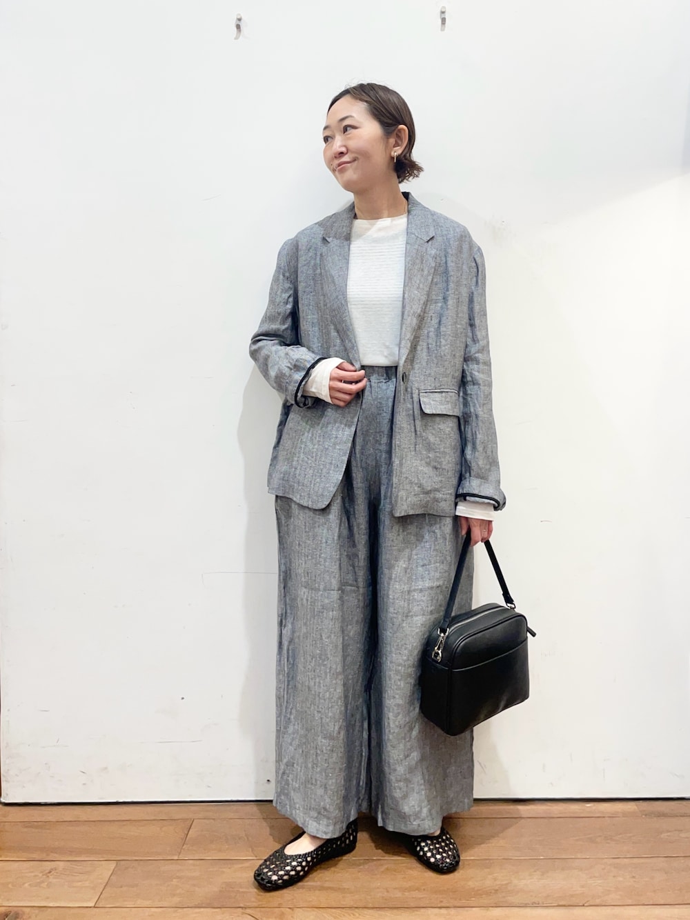 いつもご覧いただき、ありがとうございます😊 4月も宜しくお願いします🌷 ジャケットとパンツのセットアップを着てみました! ジャケットはカチッとしすぎず、デニムやチノパンと組み合わせても可愛いです✨ パンツはしっかり太めで、シルエットが可愛いです💡 ウエストもゴムなのでリラックスして穿いていただけます☺️