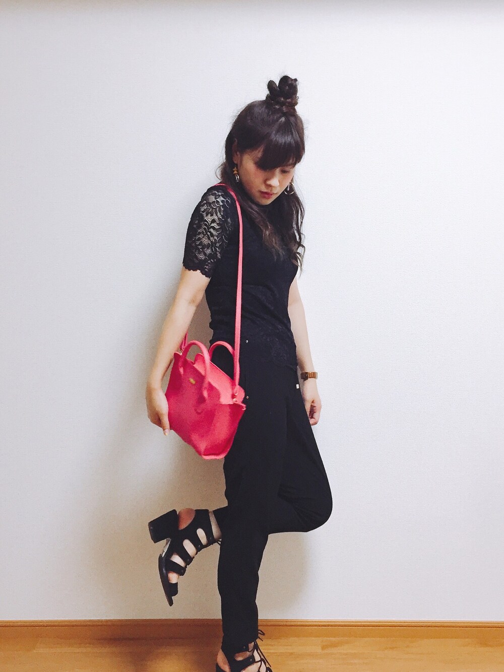 オールブラック💕バッグはあえてのピンク!以前sweetの付録だったもの…⭐︎レーストップスはchicoでセールしてました😍✌️