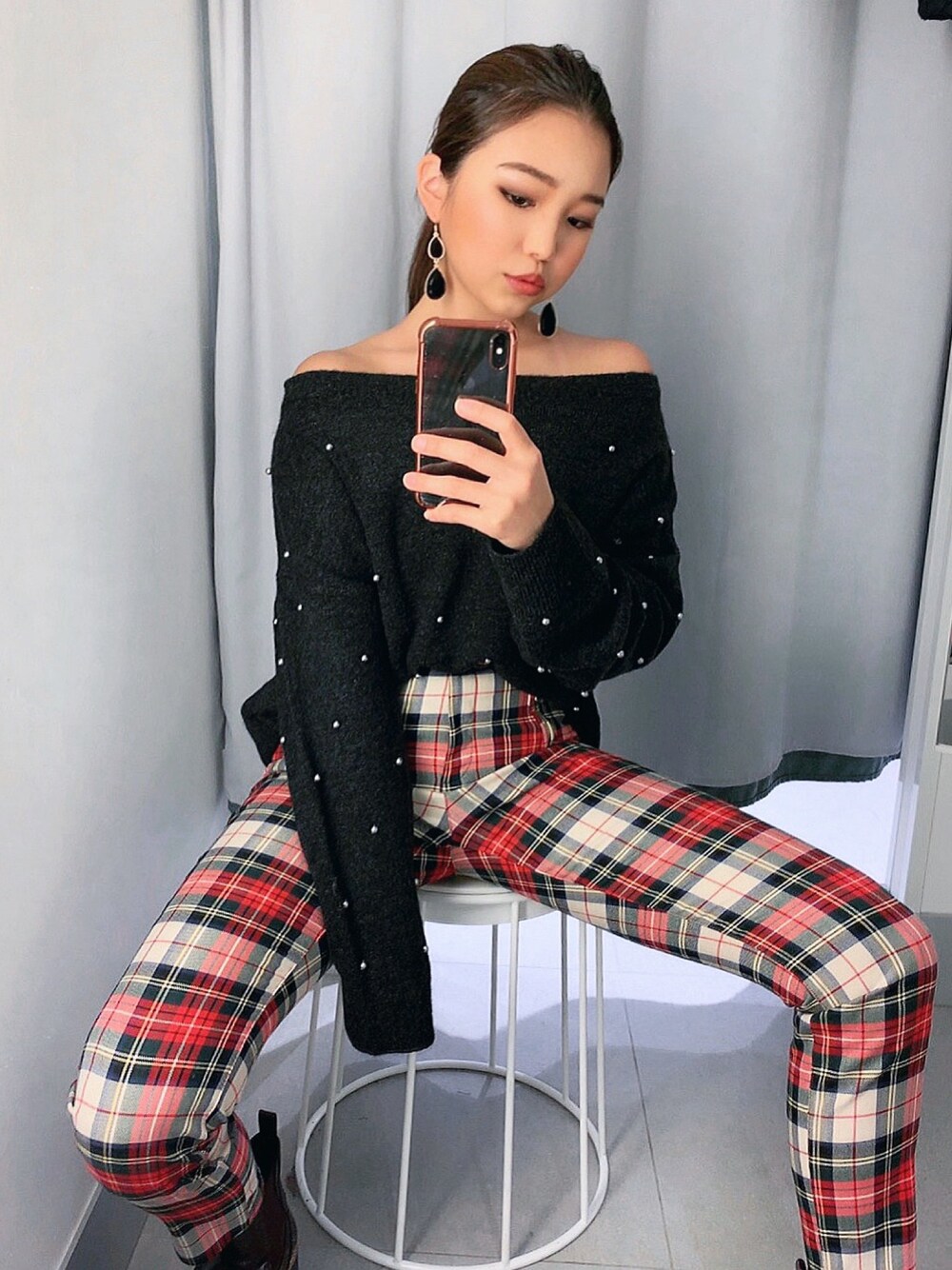 グレー系のニット/セーター、レッド系のパンツを着用したレディースの冬コーディネートの1枚目の写真