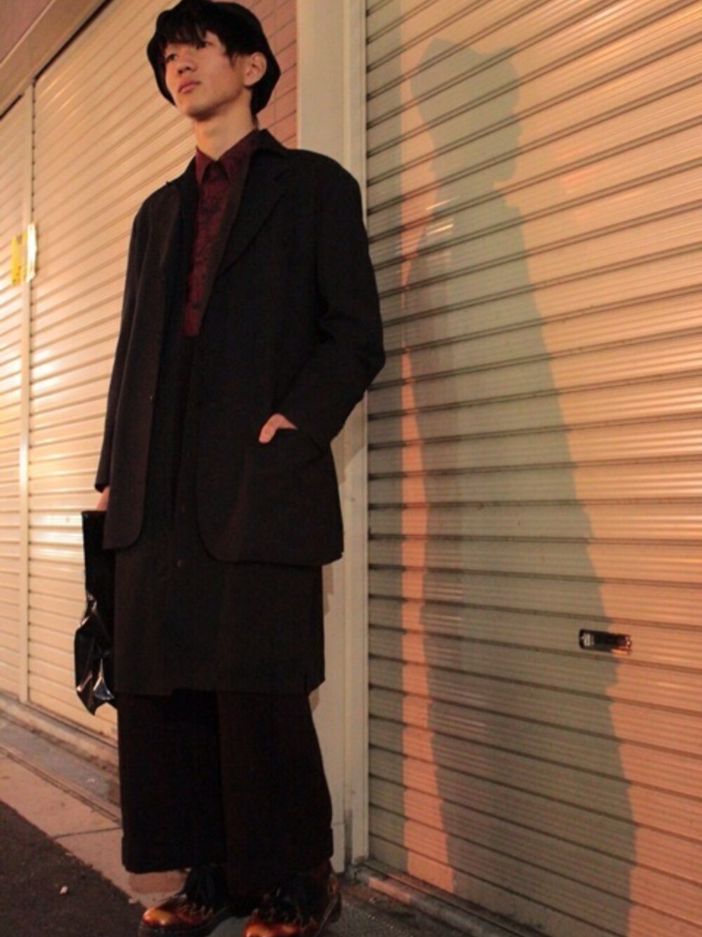 シャツを差し色に シューズで遊び心を。 ロングシャツの上に綺麗に落ちるジャケットを重ねて着ています。 全体的に下に落ちるシルエットをイメージしてみました。
