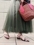 【着用サイズ】M【普段サイズ】23.0cm/Mサイズ【足幅】普通【おすすめポイント】キレイめ派にお勧めの華奢見えサンダル。2WAYがコーディネートの幅を広げてくれます。バッグはレザーの持ち手がエレガント。上質な大人のカゴBAG。