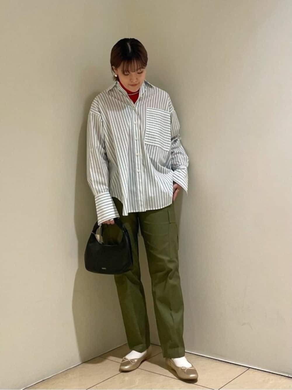 定番のカーゴパンツは、太すぎず程よく華奢なシルエットなので、カジュアルになりすぎず着用頂けます!グリーンのストライプシャツと色味を合わせて、統一感を出したコーディネートにしてみました!