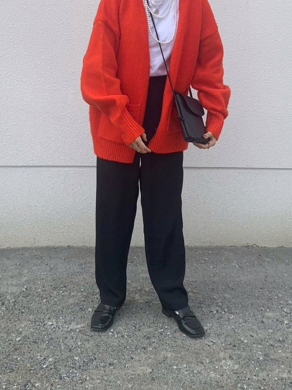 急に寒くなったから慌てて買いたてのカーディガンをおろした! いつもあんまりしないモードなスタイリング。 パールネックレスで抜け感をプラス◎