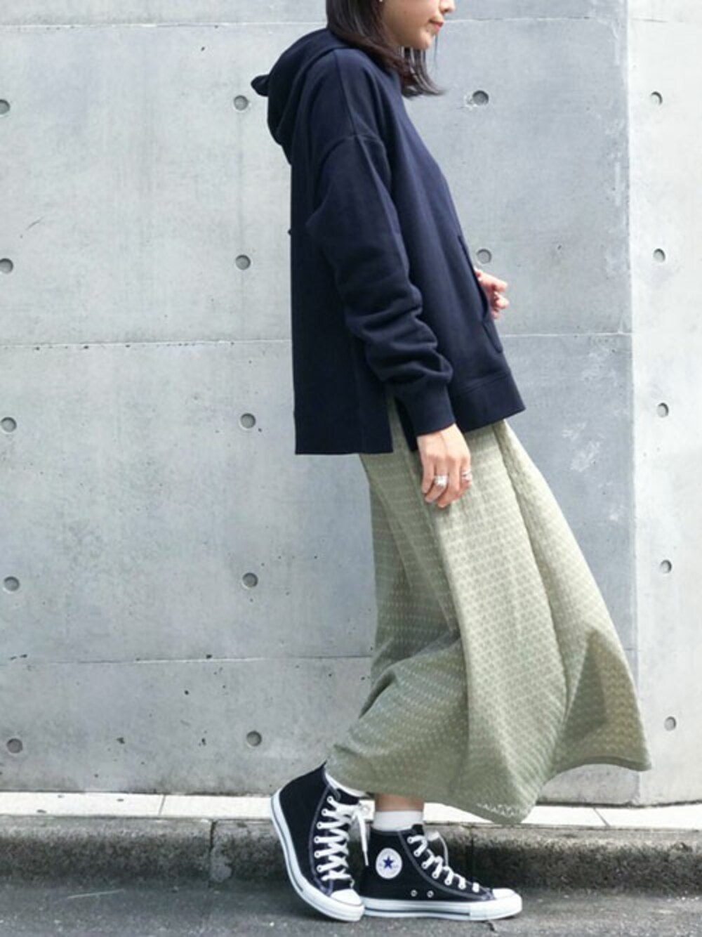 レディなレーススカートにあえてカジュアルアイテムを合わせてテイストをミックス。ありそうでなかったくすんだカーキグレーがお気に入り。
