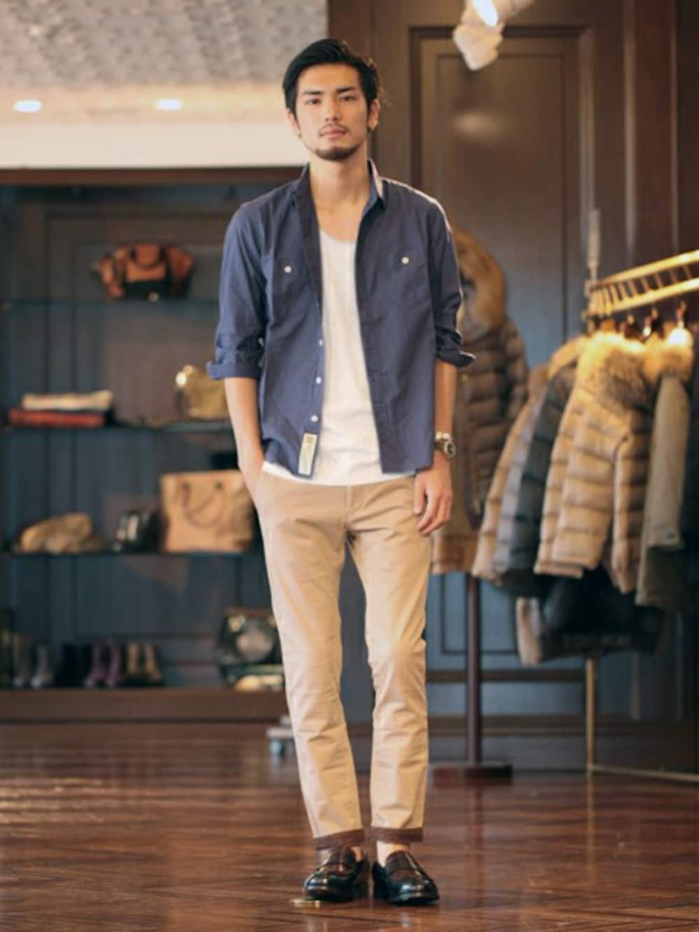 カットソー+シャツのシンプルな組み合わせながらも、パンツの裾の折り返しのカラーと、ローファーの色をそろえる等、細かなところに小技を効かせてスタイリングしてみました。