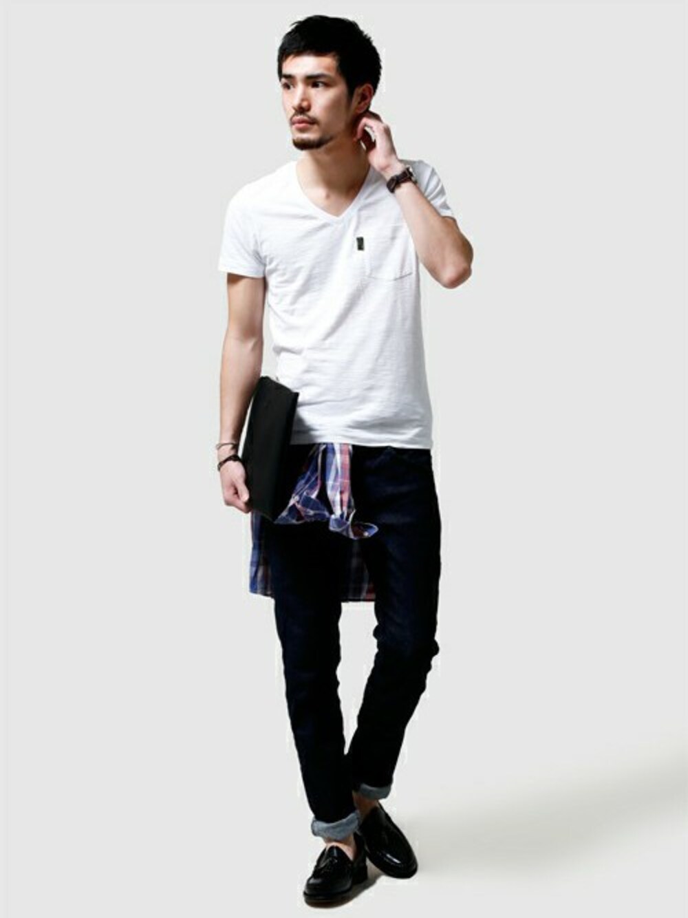 白Tとデニムパンツの定番スタイルをベースにしたコーディネート。足元をローファーにすることで、上品で大人っぽい雰囲気になります。アクセントにした腰巻のシャツは、コーディネートになじむようパンツと同色に。
