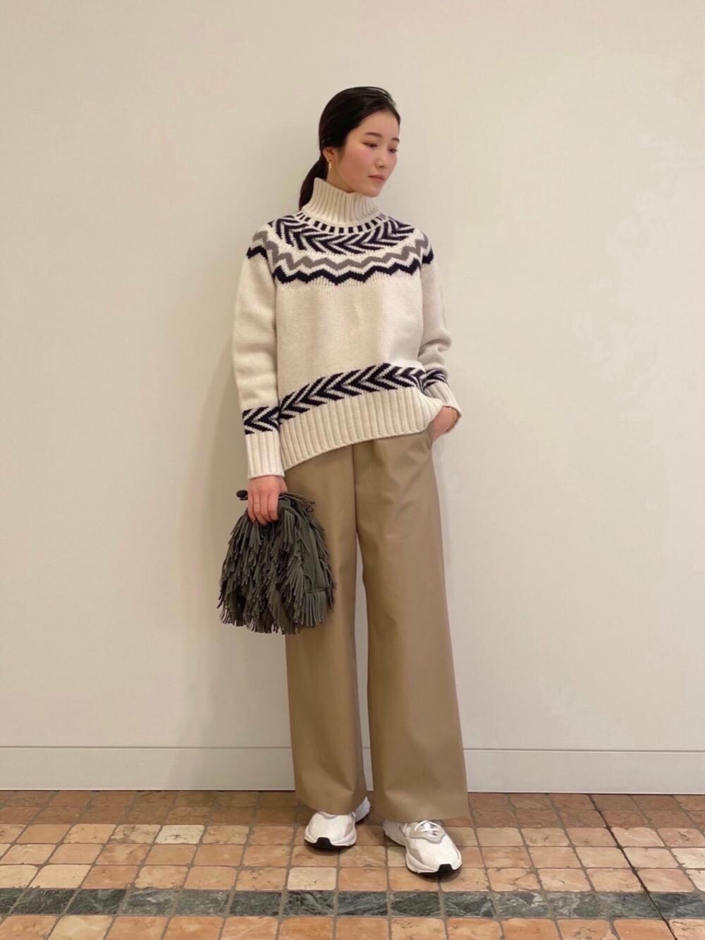 ●身長 167cm ●普段サイズ トップス・ボトムス:38 シューズ:24.5cm 【サイズ感】 ニット:全体的にゆとりのあるサイズ感です。 パンツ:標準的です。 シューズ:通常のサイズ感で問題ございません。 【素材感・着心地】 ニット:肉厚でやや重量感のある素材です。 パンツ:フェイクレザーなので、軽くて履きやすいです。 シューズ:とても軽く、足幅も広めなので歩きやすいです。 【コーディネートポイント】 優しく暖かい雰囲気になるように、全体的に淡いカラーのアイテムを合わせました。 足元はキメ過ぎず、あえてスニーカーを合わせた点もポイントです。