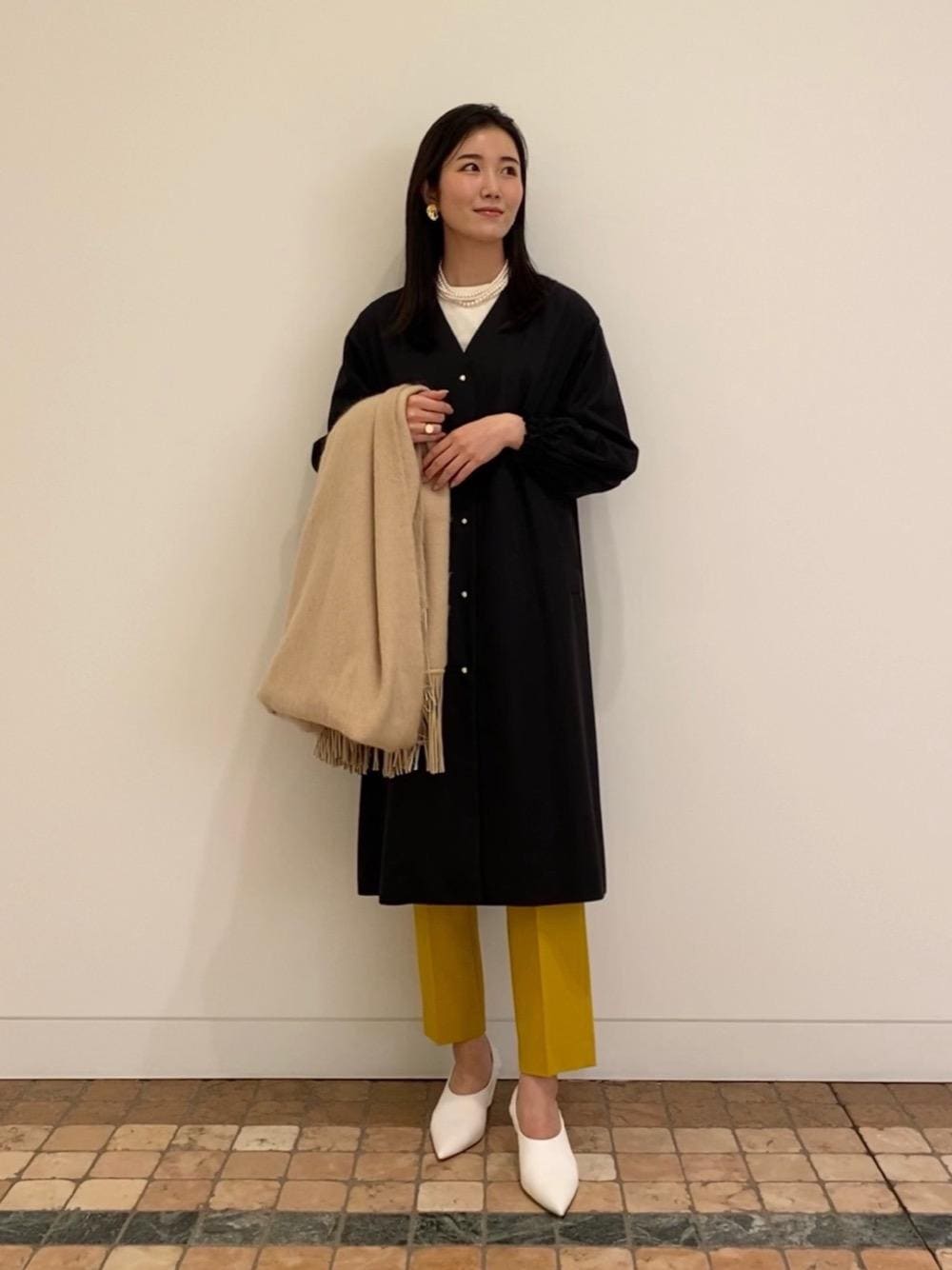 【身長】167cm 【普段サイズ】 アウター:38 トップス:38 パンツ:38 or 40 シューズ:24.5cm 【サイズ感・素材感】 ●アウター 肩幅や袖丈など標準的なサイズ感です。 少し地厚なワンピースを着ているような感覚で、軽い着心地です。やや光沢があります。 ●ブラウス 身幅や着丈などサイズ感は標準的です。 表面はシャリ感のある素材で、カットソーが内側に付いている仕様です。 ●パンツ 標準的なサイズ感です。 裏地なしの軽い着心地です。 ジップが付いているので、着脱を繰り返すことでゴムが伸びる心配はありません。 ●ストール 毛足は長めで、大判ですがそこまで重くないです。他の素材への毛移りはややあります。 ●シューズ サイズは通常のサイズ感で問題ございません。 ギャザー部分も柔らかく、太めのヒールで安定感があります。 ●イヤリング 挟みが柔らかいので、長時間付けていても痛くなりにくいです。 【コーディネートポイント】 今の時期に最適な軽アウターを使って、スタイリングを組みました。 足元は明るいカラーを取り入れることで、パンツのカラーが映えるようにしました。