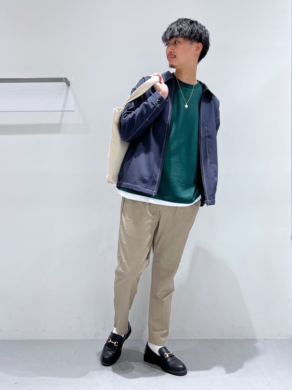 ご覧頂きありがとうございます☺︎ スワイプすると別角度の画像もご覧になれます。 グリーンのトップスで今っぽく☕︎ 【着用感】(180㎝/63kg/27㎝) ▪︎アウター(Lサイズ)…少しゆったり ▪︎インナー(XLサイズ)…ゆったり ▪︎パンツ(XLサイズ)…ジャスト ▪︎シューズ(Mサイズ)…大きめなので普段LサイズですがMでぴったり トレンドを抑えつつキレイめ要素もあるので 幅広い年代の方にオススメのスタイリングです◎