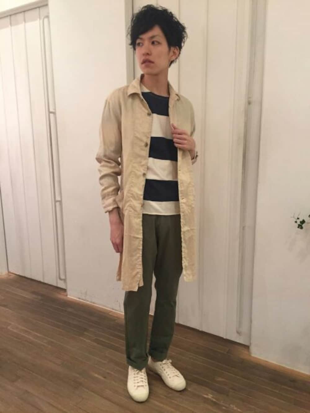 上質なリネンコートをカジュアルに合わせました! インナーのボーダーでアクセント。 トップスとボトムスの色の相性も良いスタイルです。