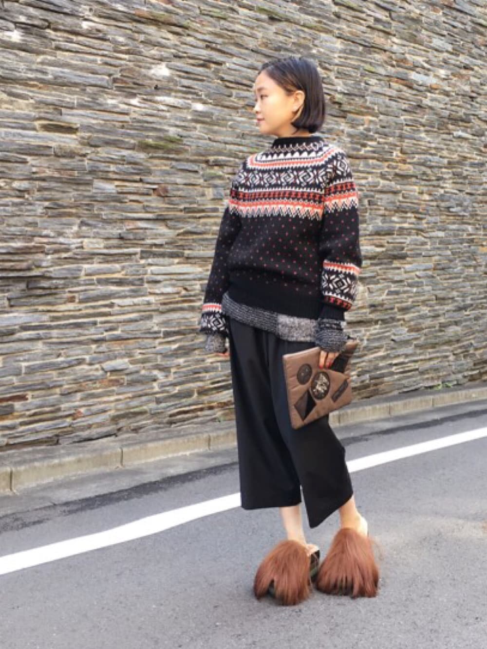 ノルディック柄のニットは1枚で着ても柄×柄でレイヤードしてもかわいいですよ!