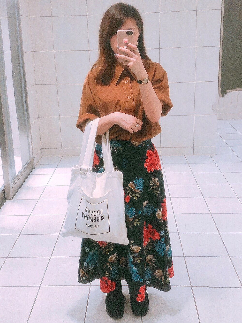 上下古着屋さんで購入。 派手スカート×シンプルシャツ×スニーカー 夏の鉄板お気に入りコーデでした。 ◎point👀** ビックシャツ