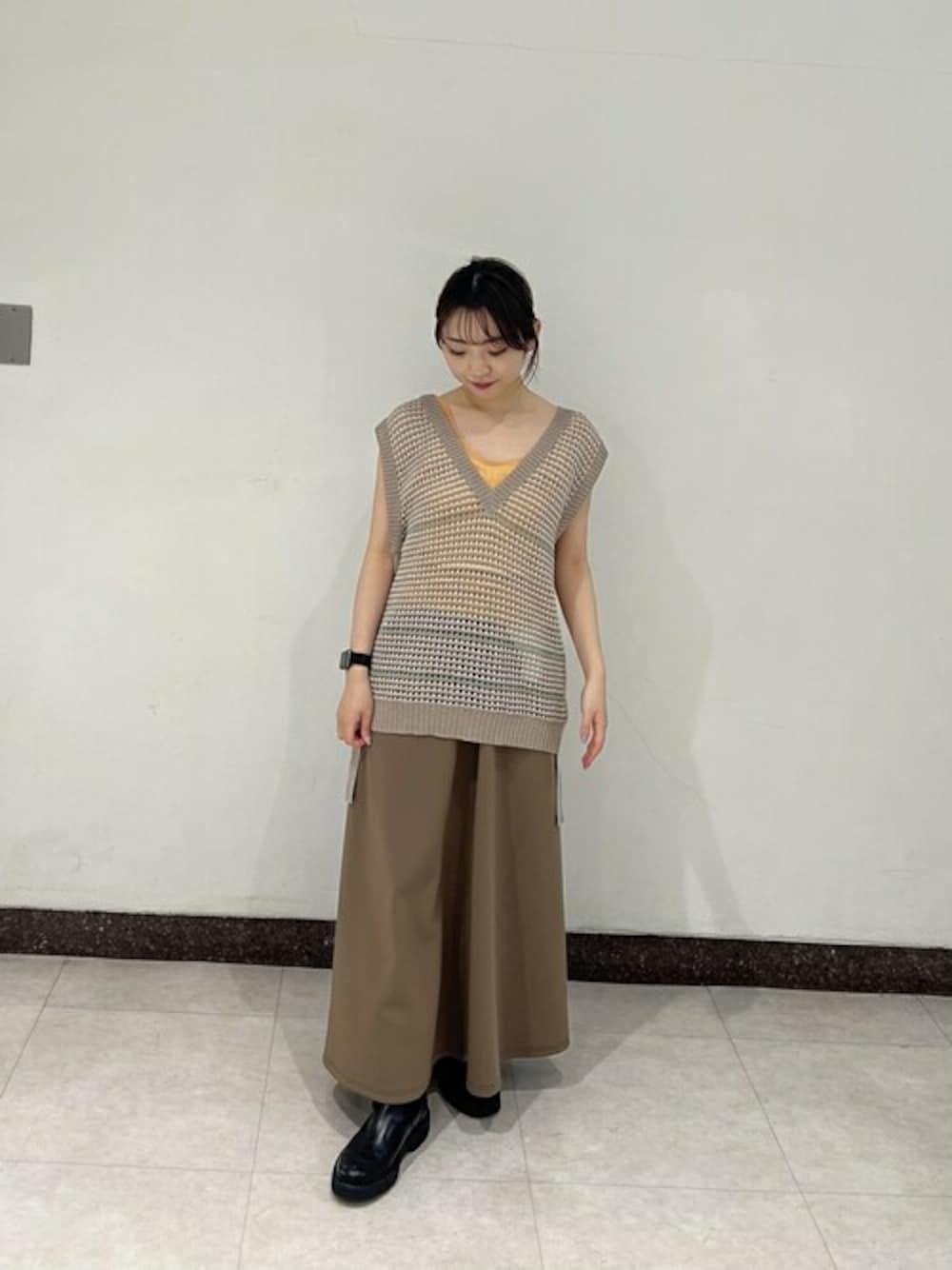 和紙トップスを使った夏のワントーンベージュコーデです。トップスはベストとして着ても可愛いですが、今回はインナーにタンクトップをいれて、涼しげなノースリトップスとして着用しています。スカートは軽くて広がり方が可愛いです。