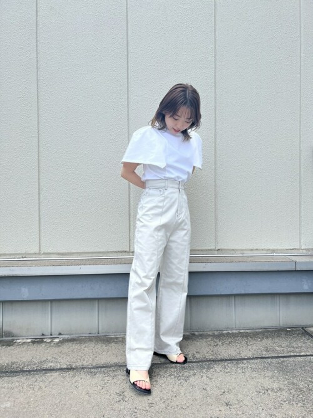パワーショルダーのシルエットが主役のオールホワイトコーデ。トップスは丈が短めなのでハイウエストのボトムと相性抜群です。デニムは軽く楽な履き心地で、脚長に見える美シルエットがポイントです!