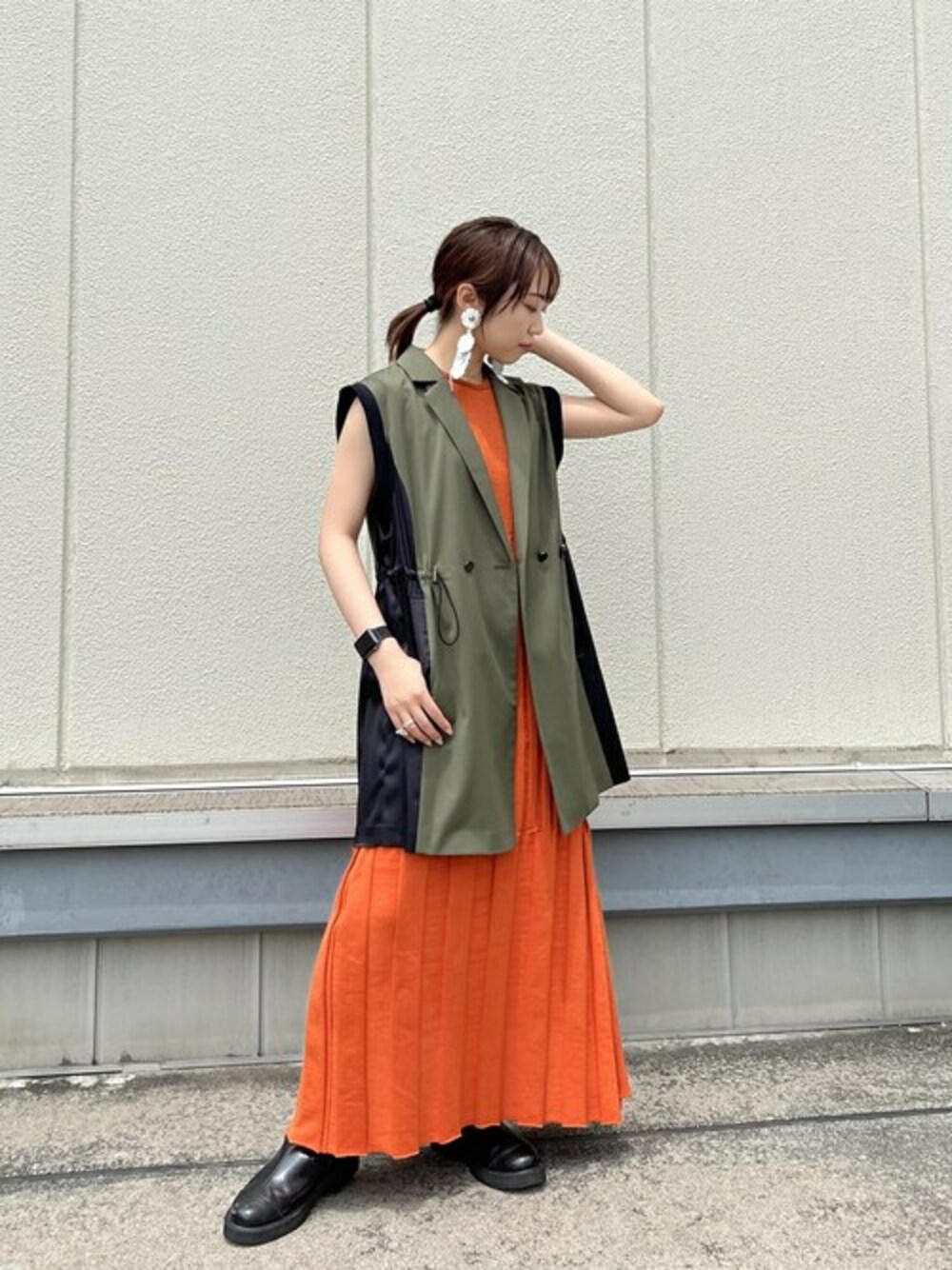 オレンジのニットワンピにカーキのジレを合わせました。ジレはウエストのドローコードでくびれ感が調整でき、細見えするのがポイント。低身長さんでもバランスが取りやすく、ワンピでもスカートでもパンツでも、合わせる服を選びません。