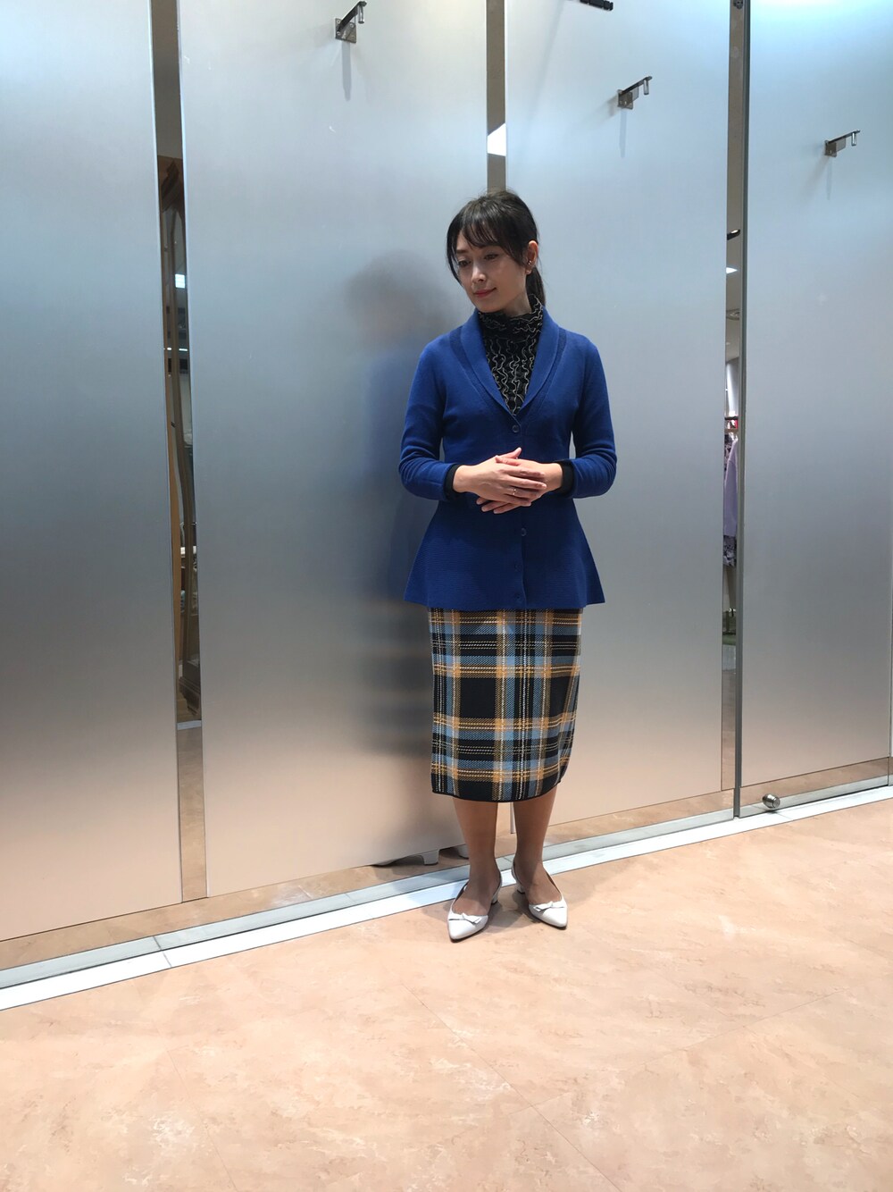 骨格タイプ:ウェーブ カーディガン 30-12-11-901 1サイズ ブルー ニットブラウス 30-12-31-613 1サイズ ブルー スカート 30-12-08-911 1サイズ ブルー オフィスでも使いやすい落ちついた色の青に秋冬らしいチェックを合わせてオフィスカジュアルスタイル。