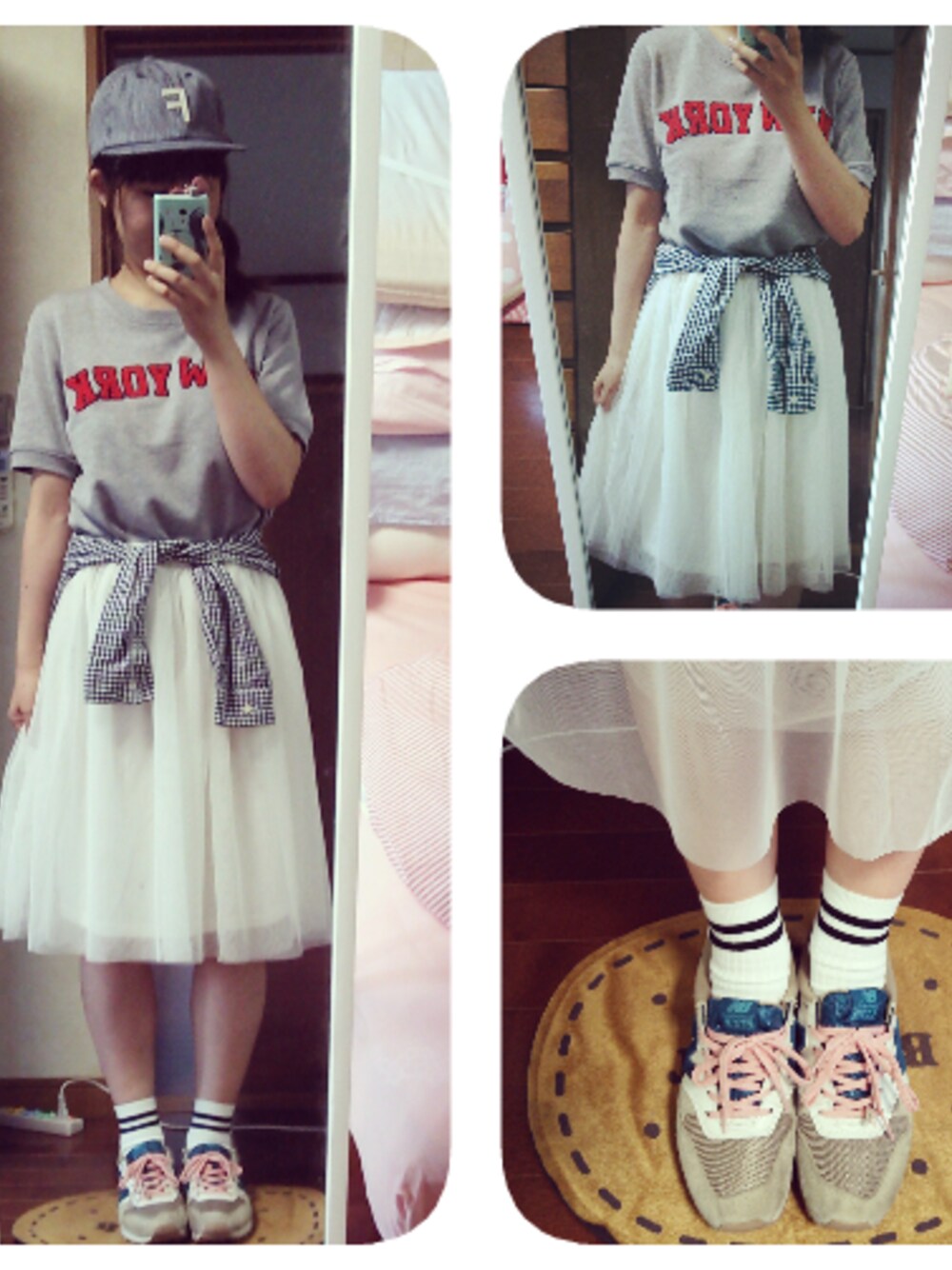 *トップス▽LOWRYS FARM *スカート▽earth music&ecology *シャツ▽アーバンリサーチ *スニーカー▽NB *キャップ▽Ciaopanic チュールスカートお気に入り♪