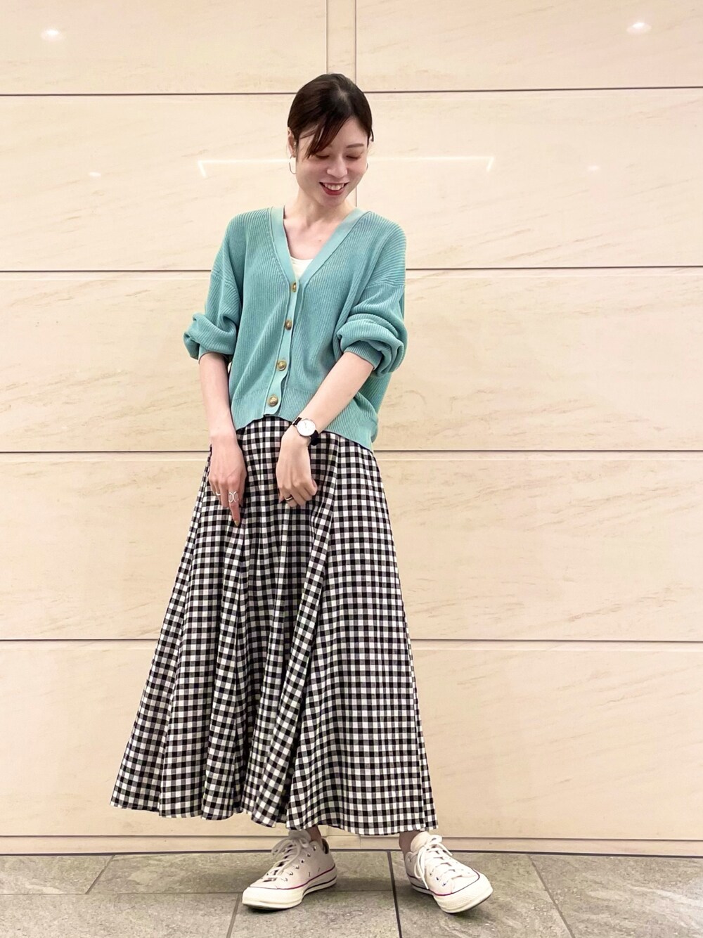 ギンガムチェックのスカートはデザインが可愛いだけでなく、リネン素材で履き心地も快適◎