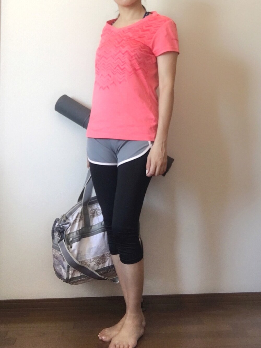ピラティススタイル。 ピラティスは動きの中で気にならないように、また体のラインがわかりやすいようにぴったりとしたウェアを着るのが一般的だそうです。 レギンスをはいてはみたけどお尻が出てしまうのは少々恥ずかしいので短パンをプラス。 これは母からのお下がりでヒマラヤのオリジナル商品だと思うけど偶然ヨガマットと色が完全リンク。 速乾素材のスポーツ用Tシャツは色が派手だけど、スポーツ用コーデでは年齢を気にしないで好きな色味を着る!と決めています。 レスポのミディアムウィークエンダーは軽くてスポーツテイストにもそこそこちゃんとした格好にも合わせられて本当に使えます。 持ち運ぶのにも軽いからジムにも1泊旅行にもOK!