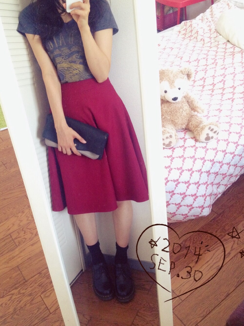 バイト後友達とお茶しますコーデ(長え) なんか今日暑いのでTシャツで。 秋色と言えなくもない色なので許して。 クラッチ持つとコーデが大人顏になっていいですね 赤スカートで疲れも吹き飛びます( ^ω^ )