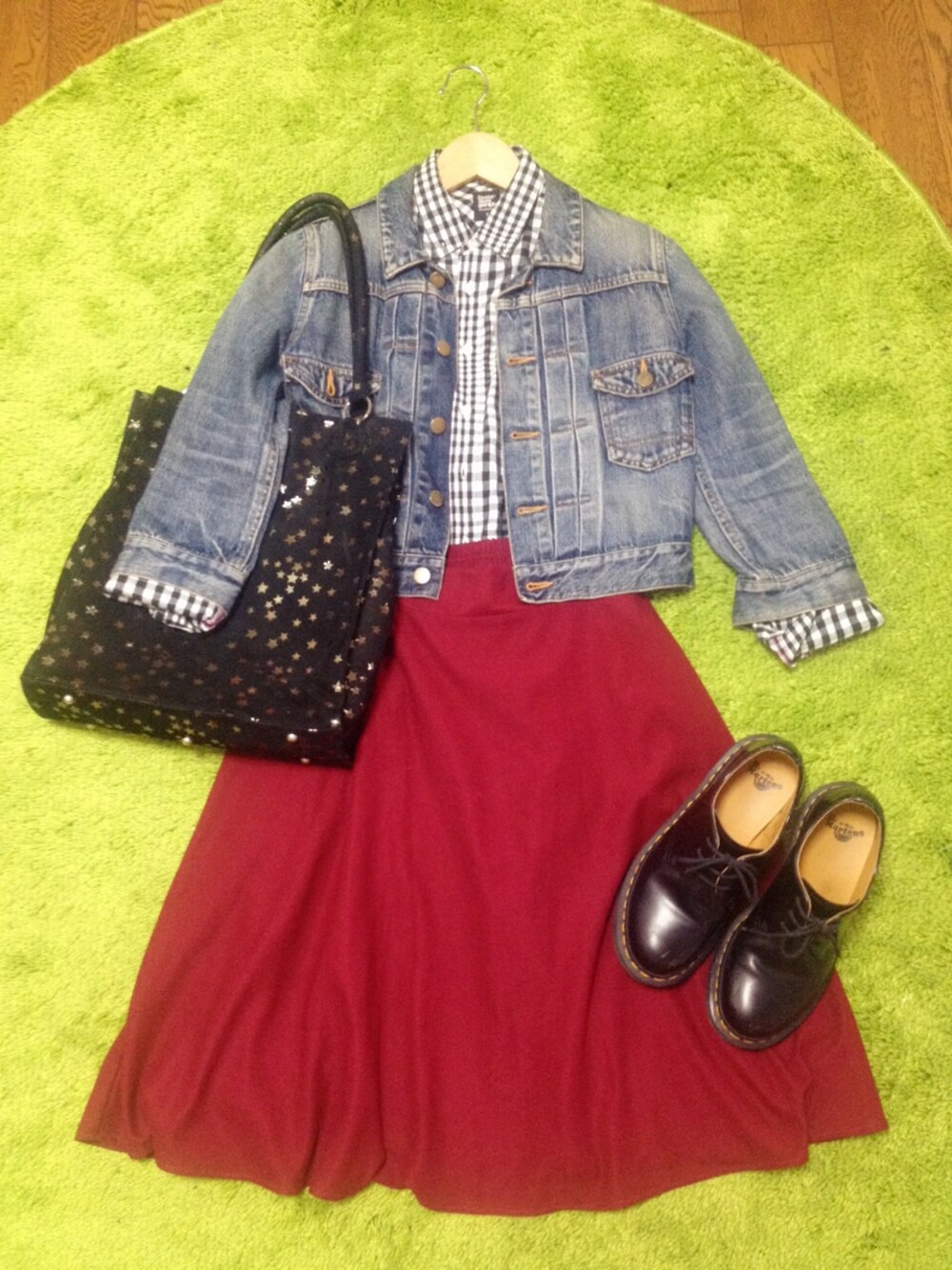 これは…いつだったかしら? 赤スカートはいいですね! コーデが明るくなるし( ^ω^ ) Gジャンだいすき! こういうショート丈アウター大好きです