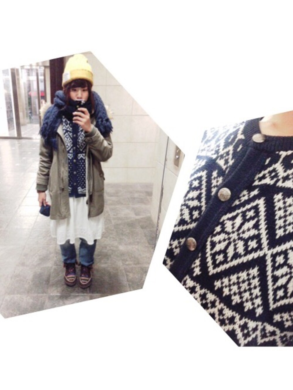 中のカーディガンは古着屋さんで見つけたもの マフラーとニットは基本装備