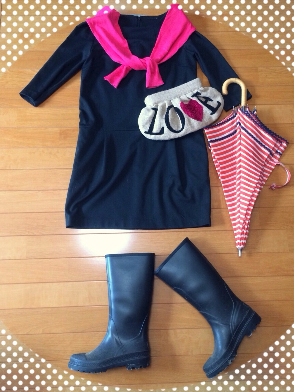ワンピース…UNIQLO カーディガン…UNIQLO レインシューズ…母のおさがり 雨の日は黒い服が着たくなります☻ 差し色は小物で♡ レインシューズはフランス製らしいです☁︎笑 今日はいいお天気ですねー♡