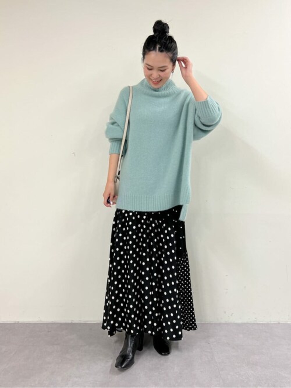 【tops】着用サイズ:F 159cmの私でしっかりお尻が隠れる丈です。 チクチクせずかなり柔らかいので 敏感肌の方も安心して着られます。 すとんと落ちるので、 ワンピースやワイドパンツと合わせてもすっきり見えます。 洗濯 :ドライクリーニング 伸縮性:あり 透け感:なし 裏地 :なし 光沢感:なし 【bottom】着用サイズ:F 159cmの私でくるぶし丈です。 0サイズだとくるぶしが見える少し短めの丈になります。 ドットの大きさが様々なので甘くならず、 1枚で簡単おしゃれに見えます。 洗濯 :手洗い 伸縮性:ウエスト部分あり 透け感:なし 裏地 :あり 光沢感:なし 【bag】 柔らかくて軽いレザーなので長時間持っても疲れません。 ショルダーはサイズ調節できるので アウターを着てももたつきません。