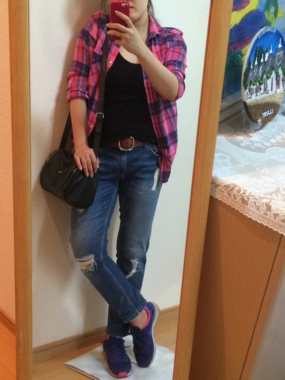 近所のスーパーに買い物👛 全く気合いの入ってないプチプラコーデ👖 特に予定のない日はいつもこんな感じ😑 ピンク×ブルーのチェックシャツ&スニーカー💕昔からピンク好き😏