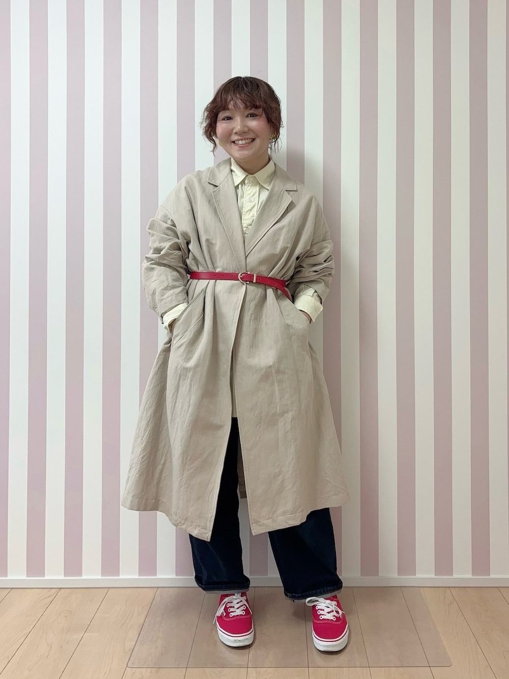 「なんちゃってトレンチ」がテーマ🤭 しっくりくる トレンチコート🧥が見つからなくて ベルトでそれっぽくしてみた🤗 ベルトとスニーカーの色を合わせて遊んだよ❤️