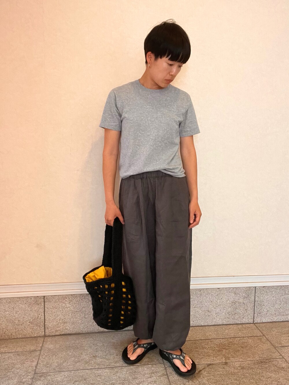 色味違いのグレーコーデ🩶 TシャツはFRUIT OF THE LOOM × BEAMS BOY✨ パンツは無印のリネンパンツ✨自分で裾にゴムを入れて絞ってリメイク✨ サンダルはOOFOS🩴 バッグはハンドメイド👜