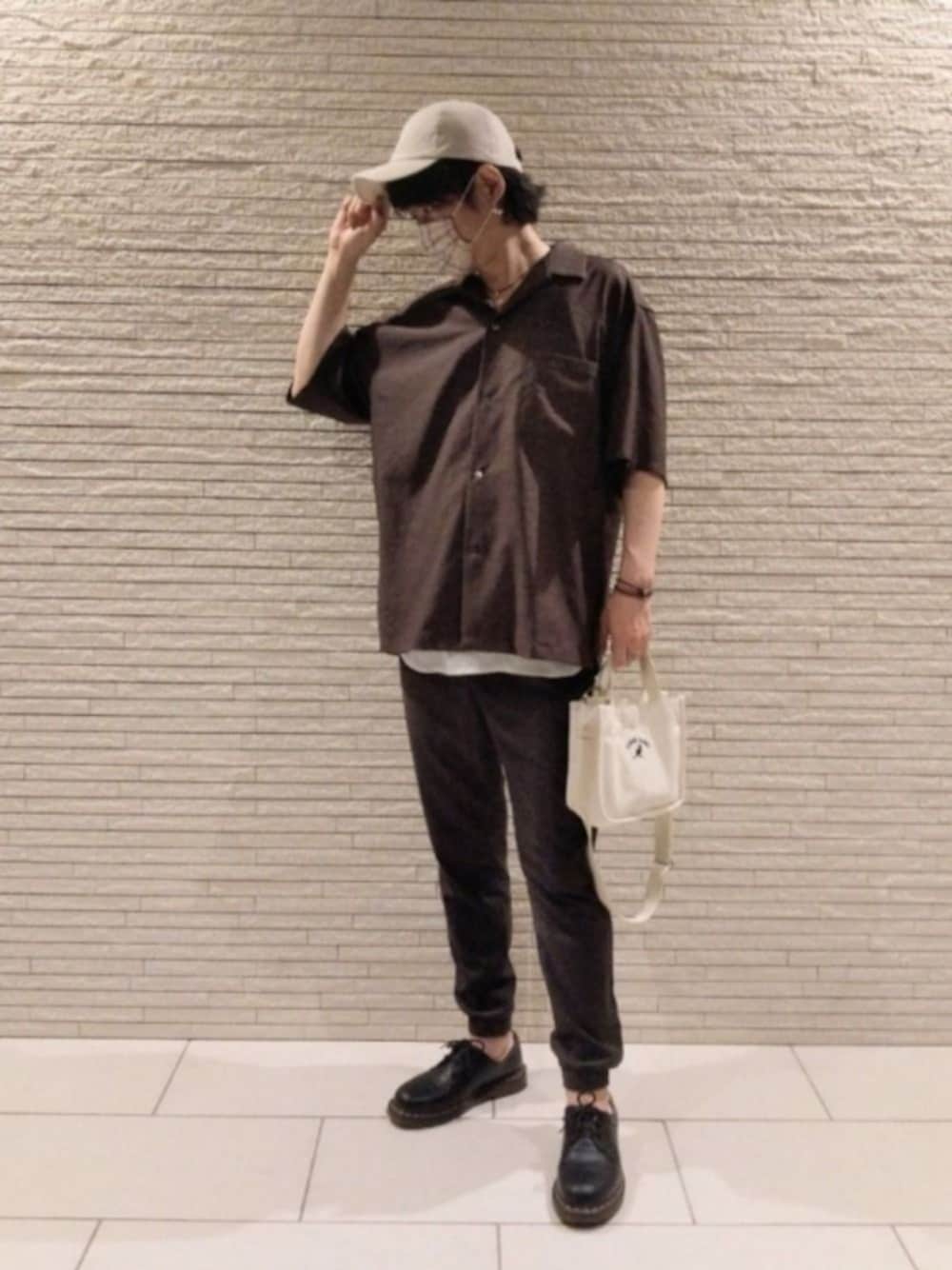 ダークブラウンのセットアップ風コーデ。 白レイヤード、足首見せ、麻素材混キャップで夏っぽく。