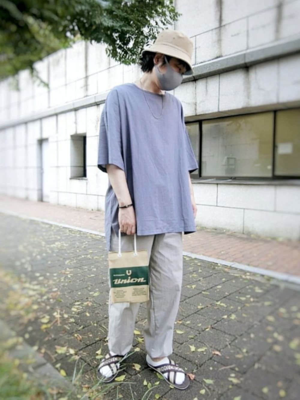 ベージュ×ブルーのストリートミックスコーデ サンダルにソックスで素足よりはラフさを消せます😃