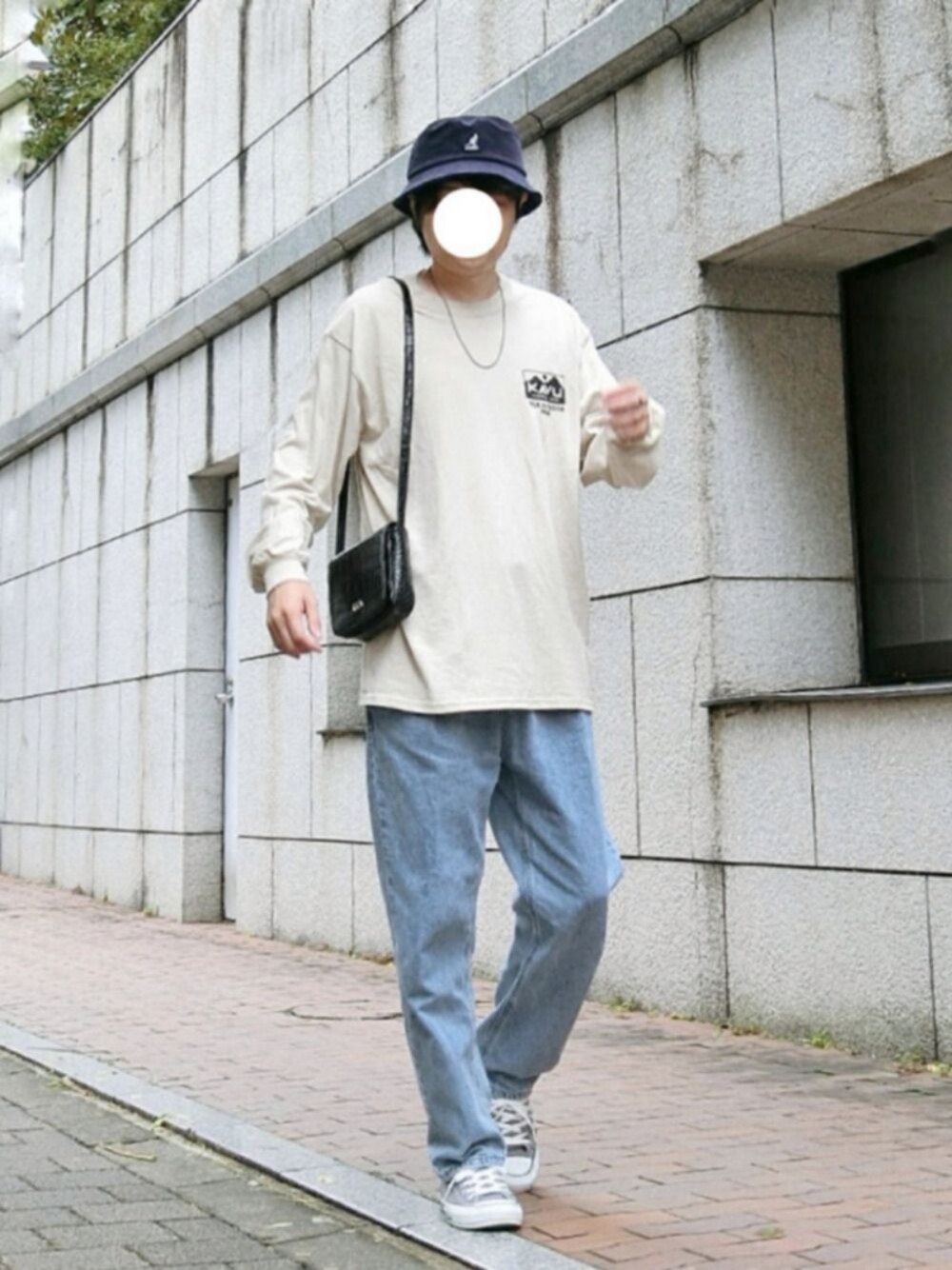 ベージュ×ブルー・ネイビー KANGOLのコーデュロイバケット色味は青強めのネイビーで、見た目より軽いしかなりお気に入りです😃 デニムパンツもシルエットや表情はお気に入りなんですが、最初匂いキツかったです(洗濯で取れました)💦