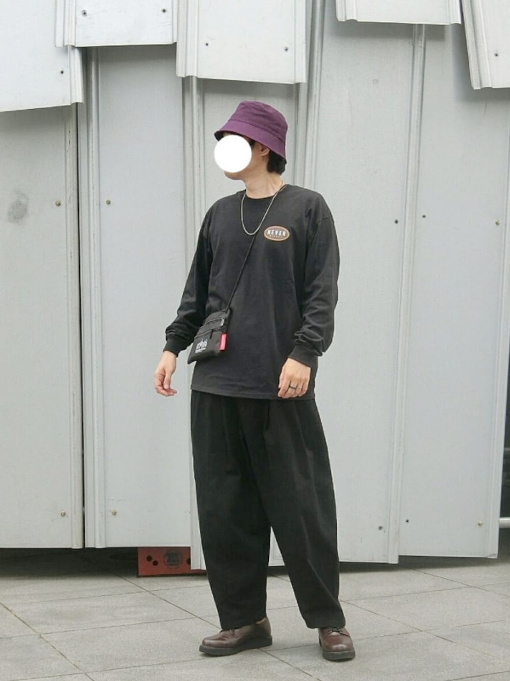 ブラックコーデ パープルのバケットがアクセント😃