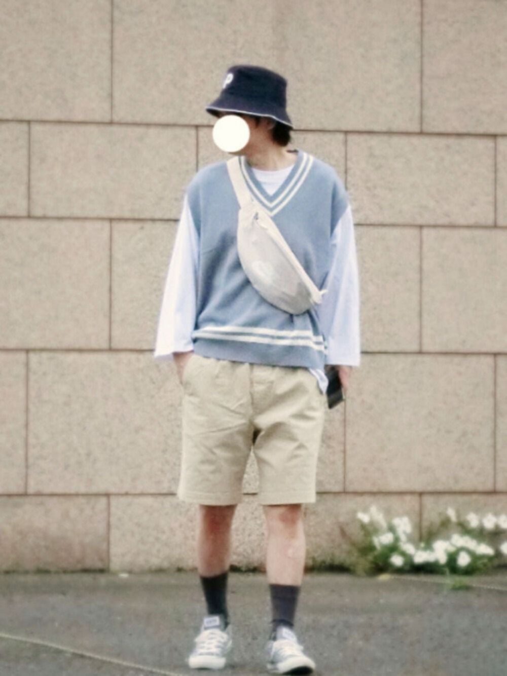 ベスト×ショートパンツ ZARA『イニシャルバケットハット』 どストライクなアイテムです🤣 レディースですが、ギリギリ頭入りました😅 なんでメンズないんだろ?