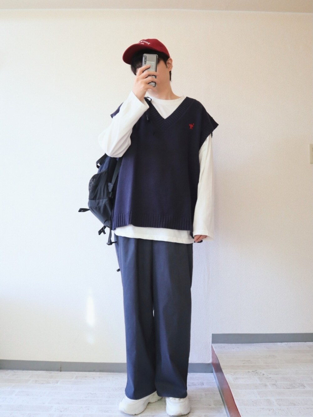 ネイビー・ニットベストコーデ。