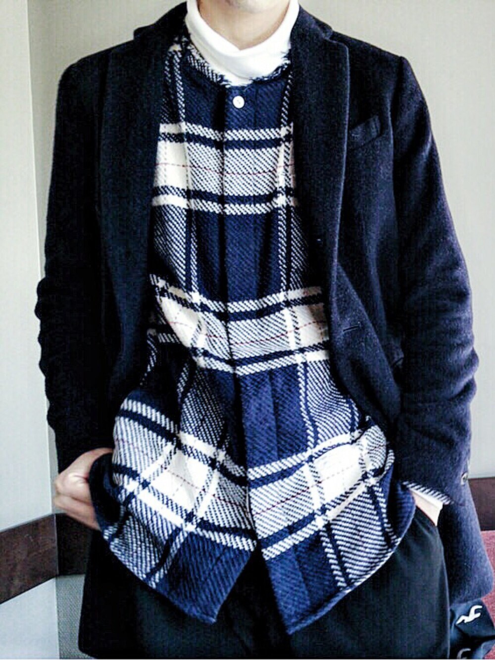 こんにちは。昨日の服装です。たまたま撮られた割にはいい感じになっていたので投稿してみました。ざっくりとしたチェックが程よく、首元のカットオフとタートルネックのレイヤードが旬な感じのコーディネートです。コートのベロア感も調子がいいですし、Iroquoisのスラックスはイージースラックスのようなものでとても履き心地よくスラックス好きな自分なんですが、毎日スラックスはしんどい、、、っていう時に最適です!