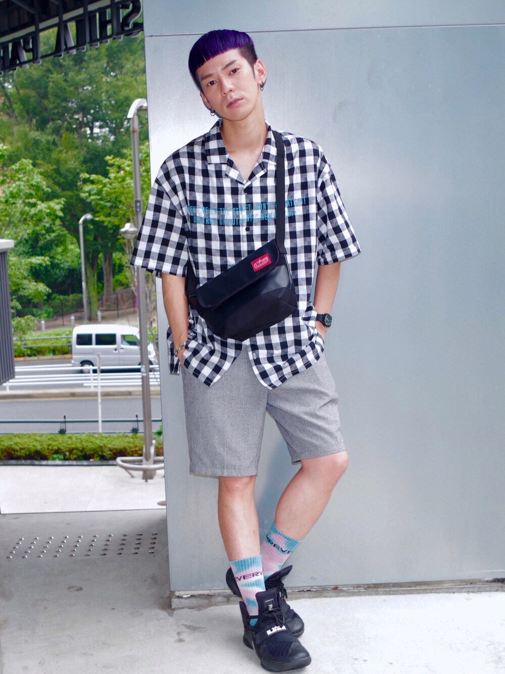 naoki42(Manhattan Portage TOKYO)のメッセンジャーバッグ「Mat Vinyl Casual Messenger Bag」を使ったコーディネート