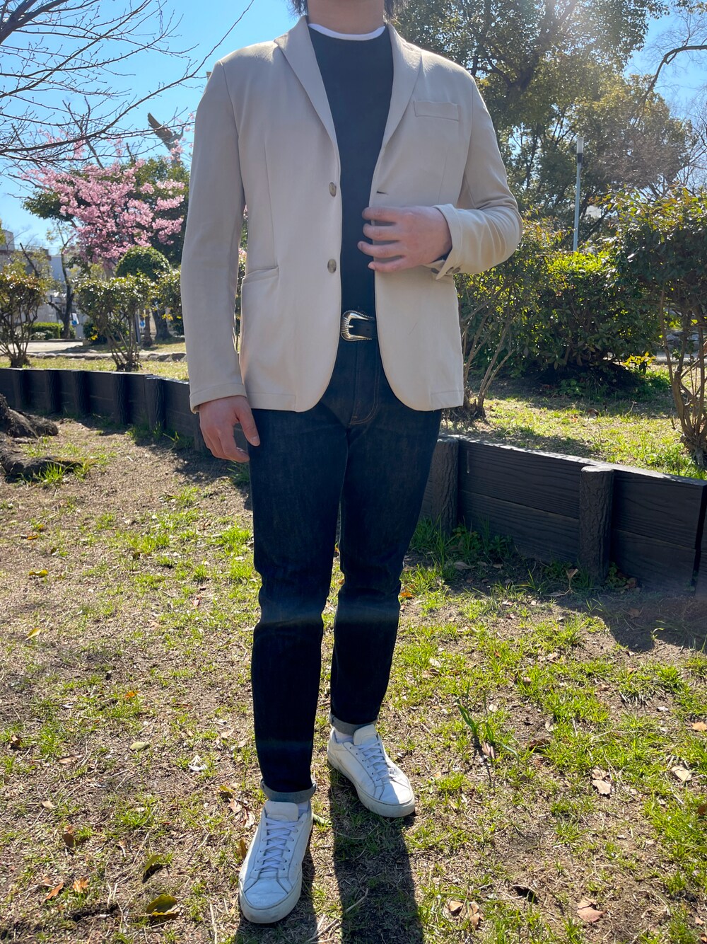 ベージュのコットンジャケットを軸にカジュアルに沿って合わせ 久しぶりにスリムフィットのデニムを履くとソワソワ感が否めない、、、