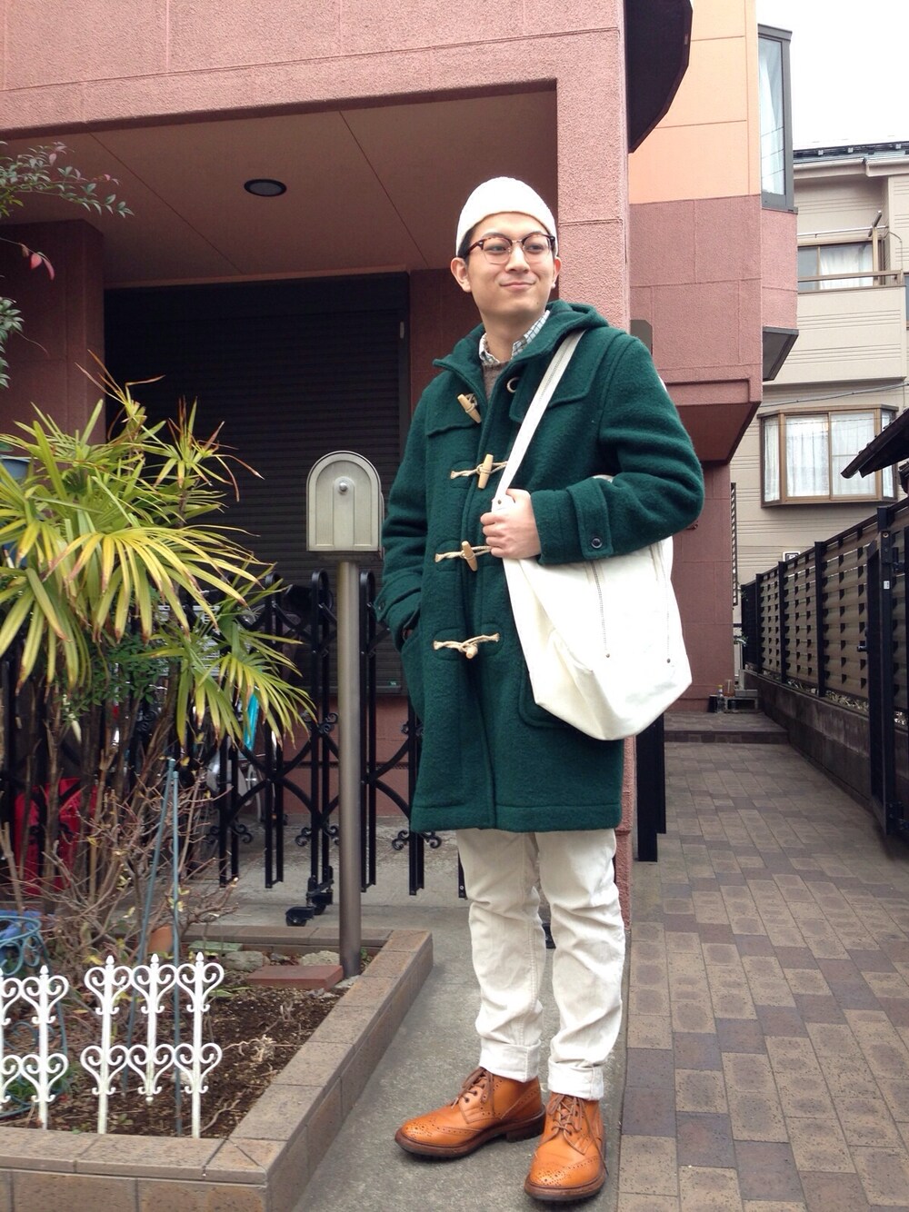 まだまだ寒いからダッフルコート! 鮮やかな緑が珍しいでしょ! 小物は白で統一してみました! ニットキャップ ? ダッフルコート アーノルドブルック パンツ scye ブーツ トリッカーズ バック ?