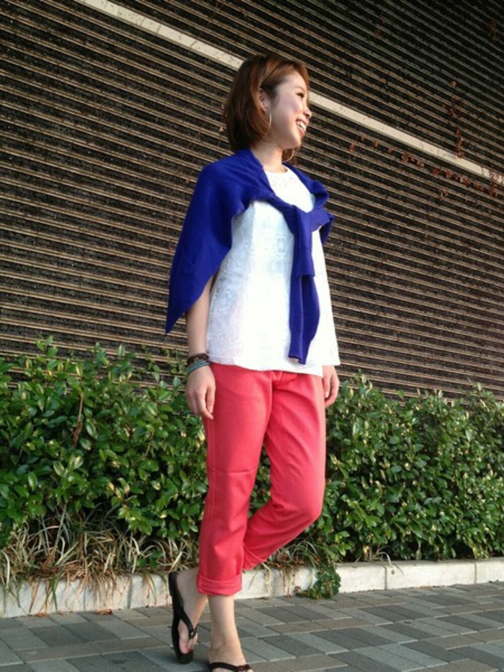 前、後ろどっちでも着れるレーストップスにネオンカラーでカジュアルポップスタイル。 今年は思いきってカラーをとり入れるのがオススメ!