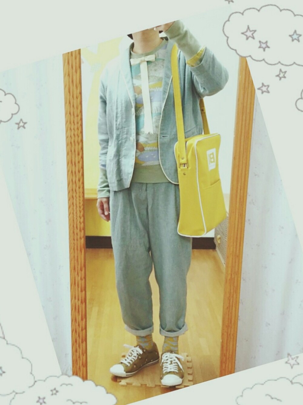 ゆるゆるセットアップ~✨ ミントグリーン、好きな色💚 今日の差し色は、イエローにしてみた☝