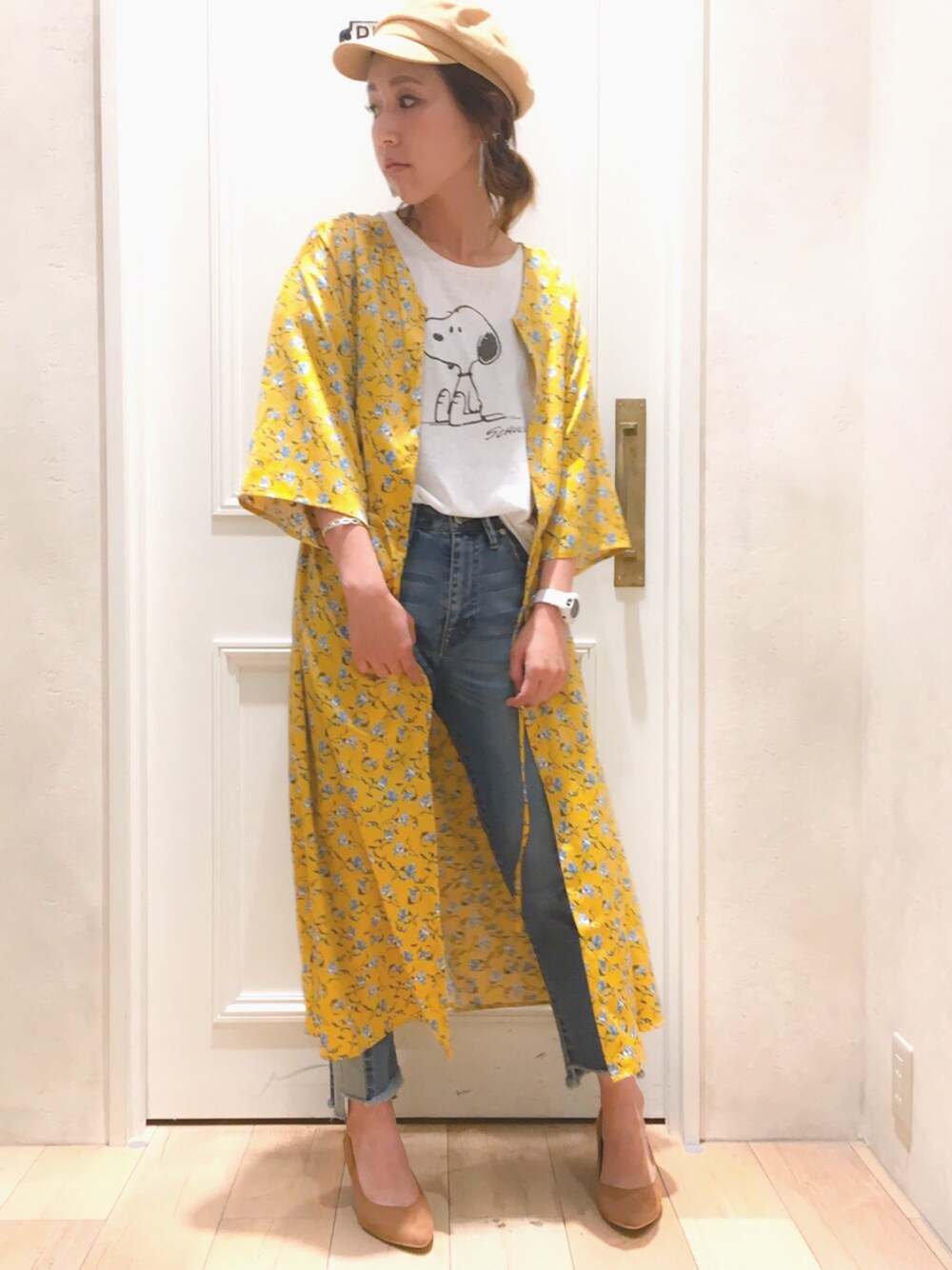 スヌーピーがプリントされてあるヴィンテージ感のあるTシャツはサイズ感もジャストサイズでとっても合わせやすいです! 子どもっぽくならないように、スッキリめのデニムとパンプスで合わせました(^^)