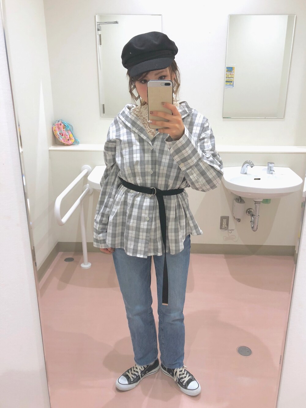 久しぶりの店頭コーデです。 新作のチェックシャツを抜き襟でガバッと開けて着たかったので、中にレースのインナーを合わせてみました。こちらのシャツはゆるっとしたシルエットなのでウエストにベルトを巻いてスッキリと◎ 色々着回しもできそうです(^^) 小物合わせカジュアルな雰囲気を意識しました。