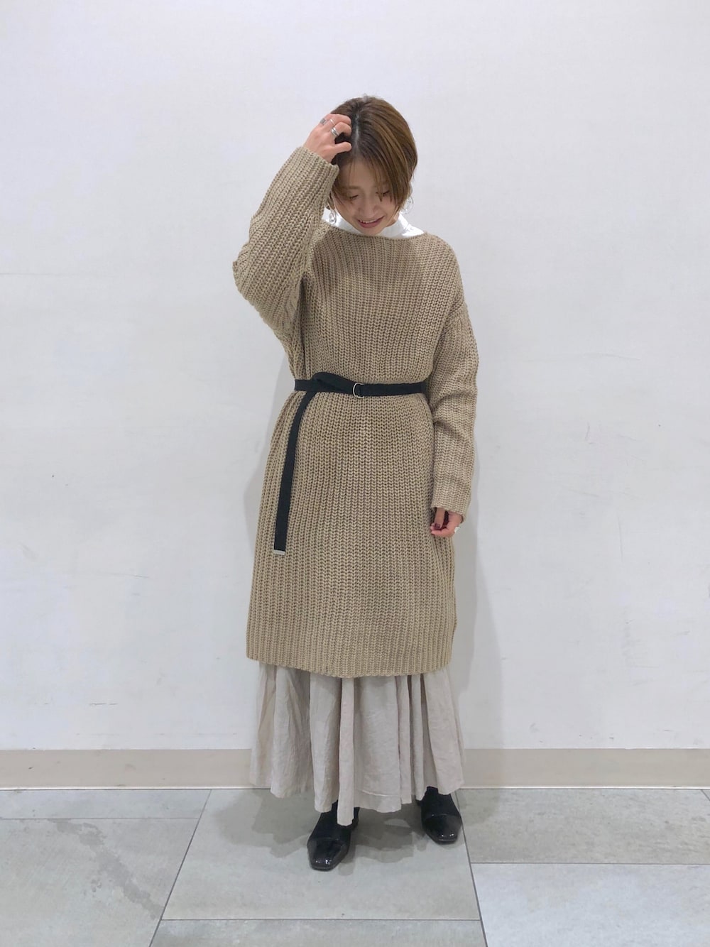 ニットワンピースにスカートを合わせて今年っぽくゆるゆるコーデ♪